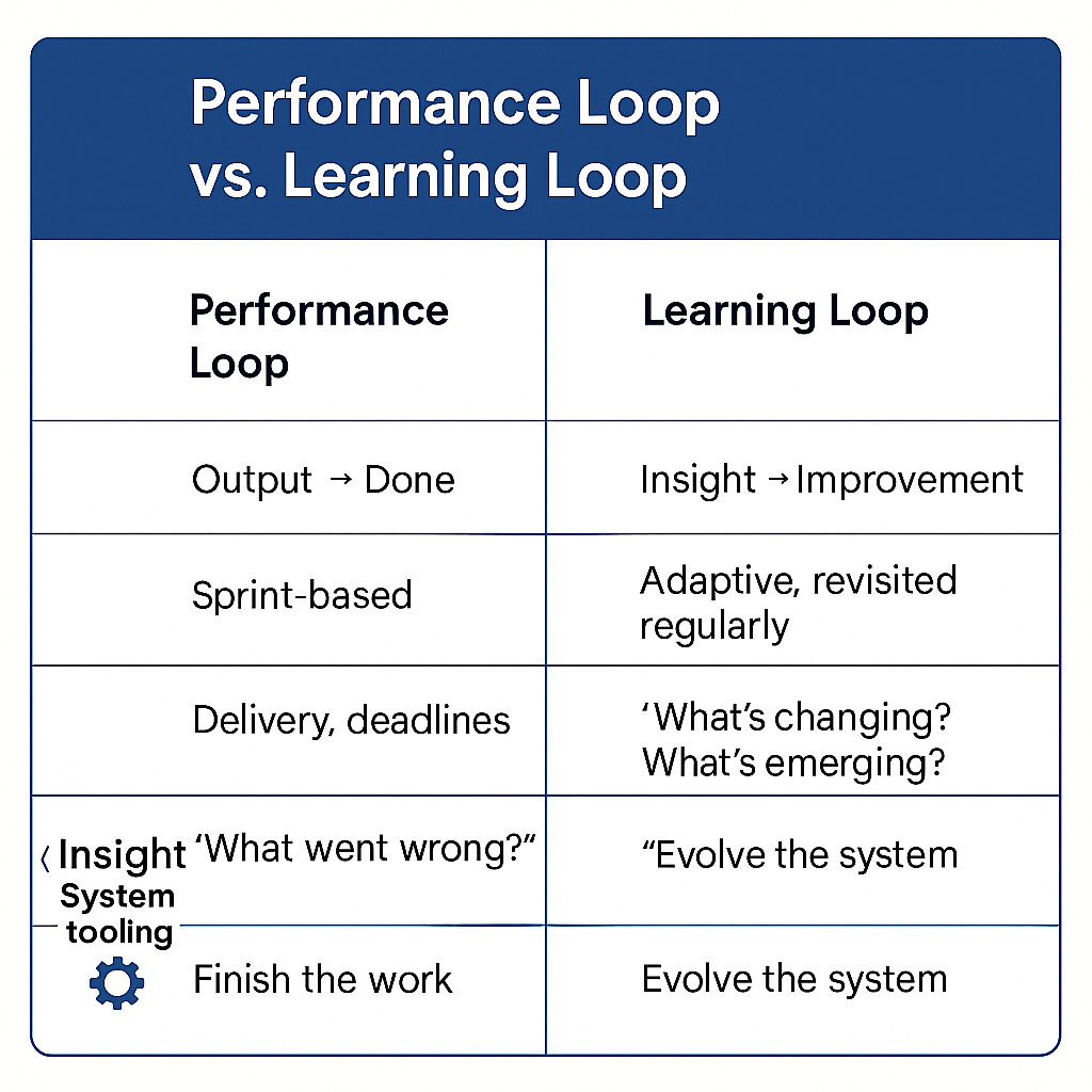 Most Agile teams operate inside a Performance Loop — focused on getting work done, meeting deadlines, and hitting sprint targets. But true agility requires a Learning Loop: a system that turns delivery into insight, and insight into change. While the Performance Loop asks “What did we complete?”, the Learning Loop asks “What did we learn, and how do we grow from it?” The difference is critical. Teams stuck in performance mode may look efficient on the surface, but they often repeat the same blockers, miss hidden patterns, and stall in their evolution. The Learning Loop closes that gap — and that’s where the real momentum begins.