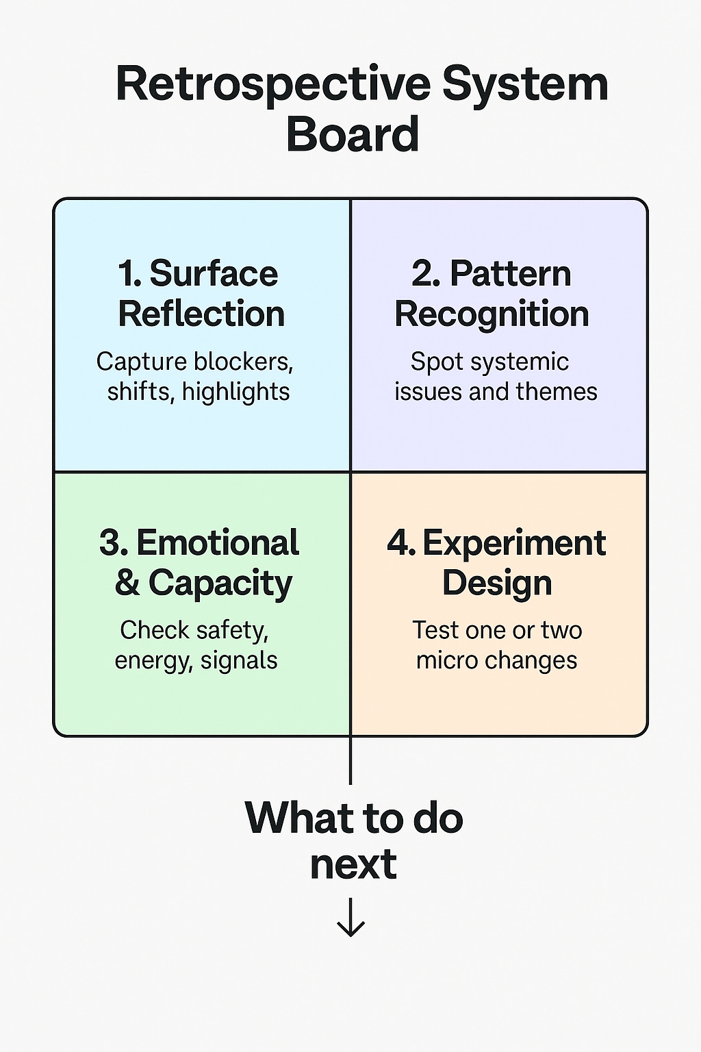 When we introduced the Retrospective System Board, the first quadrant (“Surface Reflection”) surfaced the usual suspects: vague requirements, tech debt, slow code reviews. But as we moved into Pattern Recognition, something shifted. Those same blockers had shown up in the last 6 retros. No one had connected the dots.